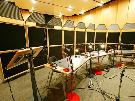 Die schwarzen Paneele im Aufnahmeraum sind mobile akustische Stellwände. In einem Raum, der nicht für Sprechakustik ausgelegt ist, und in dem bis zu 18 Sprecher/innen arbeiten, sorgen sie für die nötige "Trockenheit" der Akustik.