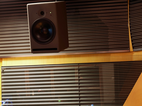Decke und Wände sind Sonderanfertigungen. Die Knicklinie der Seitenelemente befindet sich in der Hörachse, die Knicklinie wirkt als Diffuser. In die vertikalen, geknickten Elemente sind Helmholtz-Resonatoren eingebaut. Gewelltes Lochblech fungiert als (von tonarchitektur entwickelter) mechanischer Exciter - die Grundwelle einer bestimmten Frequenz wird gefiltert, die Oberwellen bleiben erhalten.