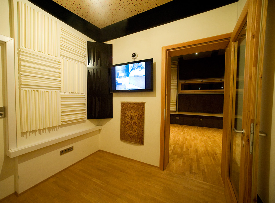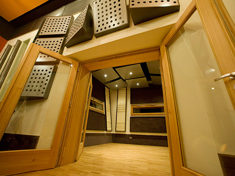 Für den zusätzlichen Raum musste eine Stahlbetonwand aufgeschnitten werden, bevor er als Konsole an die Stahlbetonwand angeflanscht wurde. Deckensegel und großflächige Diffuser-/Absorber-Elemente wirken auf das akustische Image ein; hinter den Diffusern/Absorbern befinden sich hocheffektive dynamische Wände. Die schräge Wand lenkt Schallenergie Richtung Decke.